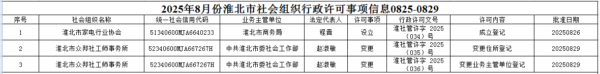 2025年8月份淮北市社会组织行政许可事项信息0825-0829
