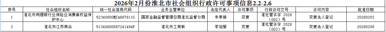 2026年2月份淮北市社会组织行政许可事项信息0202-0206