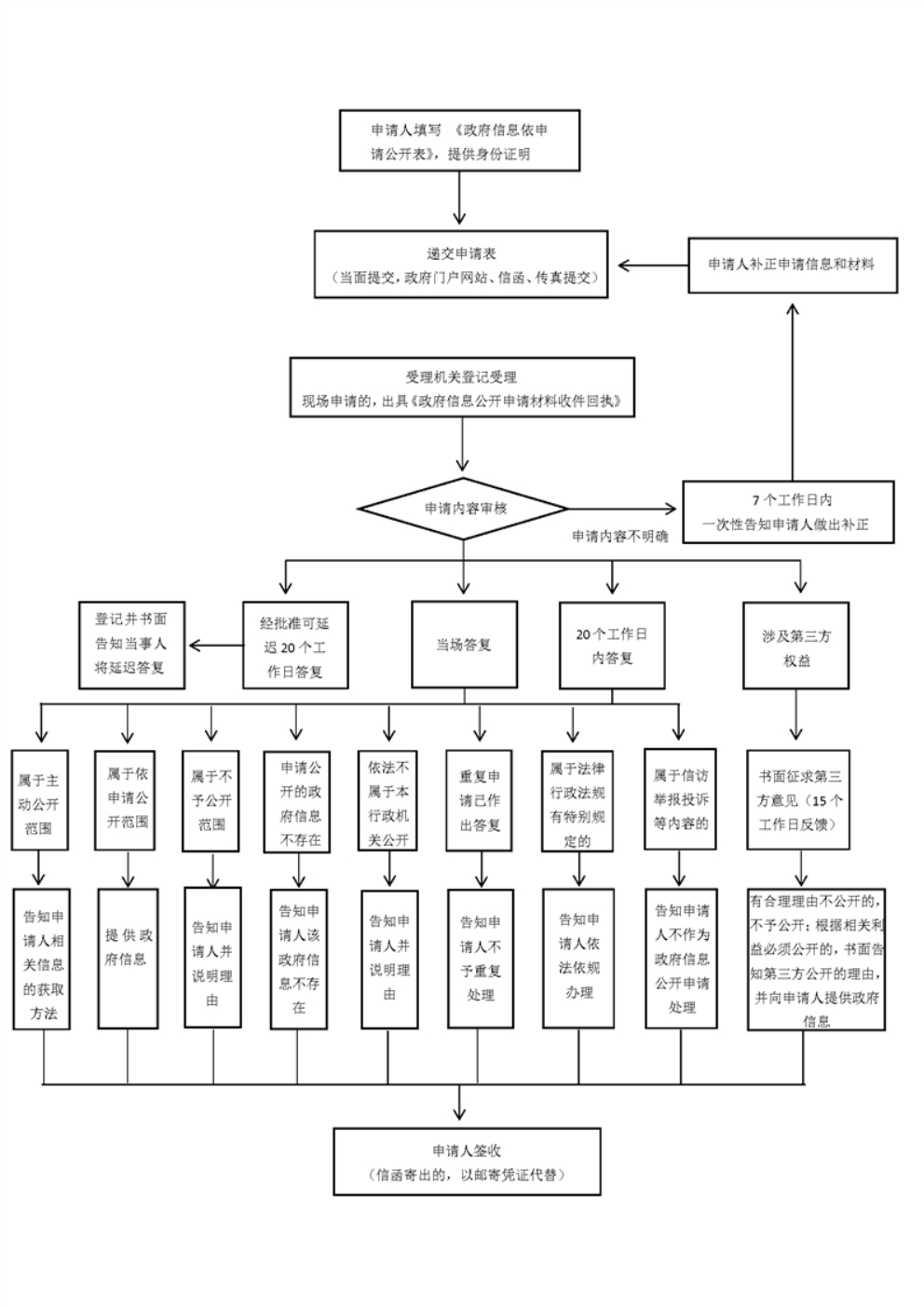 本部门(单位)收到申请后,将对申请内容进行审查,政府信息公开申请内容不明确的,要求申请人补正。行政机关收到政府信息公开申请,能够当场答复的,应当当场予以答复。行政机关不能当场答复的,应当自收到申请之日起20个工作日内予以答复;需要延长答复期限的,应当经政府信息公开工作机构负责人同意并告知申请人,延长的期限最长不得超过20个工作日。申请公开的政府信息涉及第三方权益和其他机关的,本机关将征求第三方和其他机关的意见,征求第三方和其他机关意见所需时间不计算在上述规定的期限内。